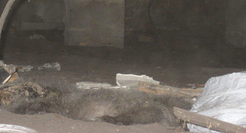 Dead animal carcass removal is specialty work. Sometimes the job is simple, such as a dead opossum in the yard, in which case we can simply wear our gloves and respirator mask, bag the carcass, and take it away for incineration. Sometimes this is more complex, such as when the dead animal is under a home crawlspace, under a porch or deck or shed. Or if the animal is larger, such as a dog or a deer. The most complex cases are dead animals inside the house. The animal may have died inside the attic, or down in the walls, or the duct work, or any other part of the architecture. You may have a bad smell in your home, and you're not even sure what's causing it. We've removed not just dead animals, but rotting food, bad mold, etc. We specialize in locating the source of the smell, and we very commonly cut a hole in the ceiling or wall to remove the animal. We remove every bit of the carcass, mop up the juices, vacuum the maggots, spray it and wipe it down with disinfectant, cleaner, and we repair the hole we cut. In some cases we use ozone machines to neutralize odor.
